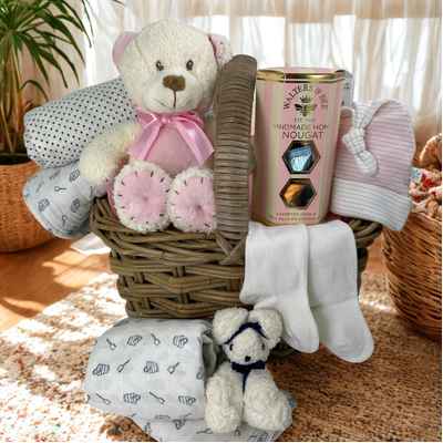 Gift Presentation – Beautifully arranged in a reusable rattan basket, cello-wrapped and finished with satin and designer ribbons for a timeless baby gift presentation.